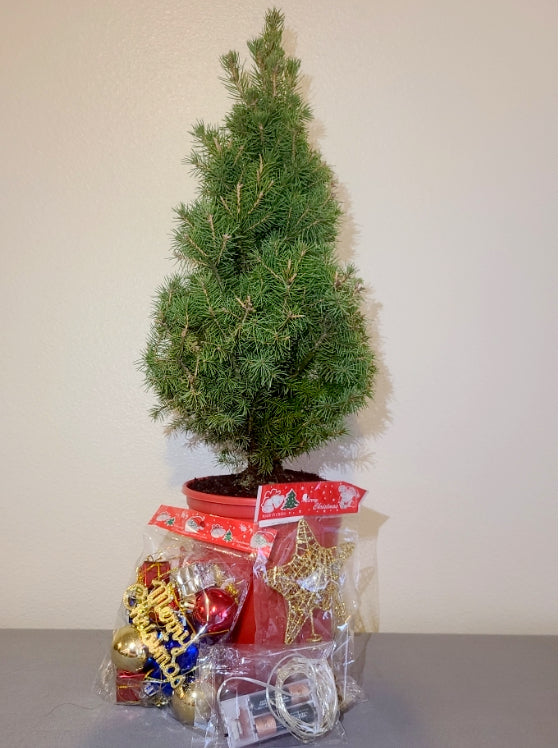 Bring home a Pacific Northwest favorite — the charming Dwarf Alberta Spruce, dressed for the holidays in a festive red pot! Each tree arrives with everything you need to create instant Christmas magic: colorful ornaments, a shining star topper, and a battery-powered LED light strand.